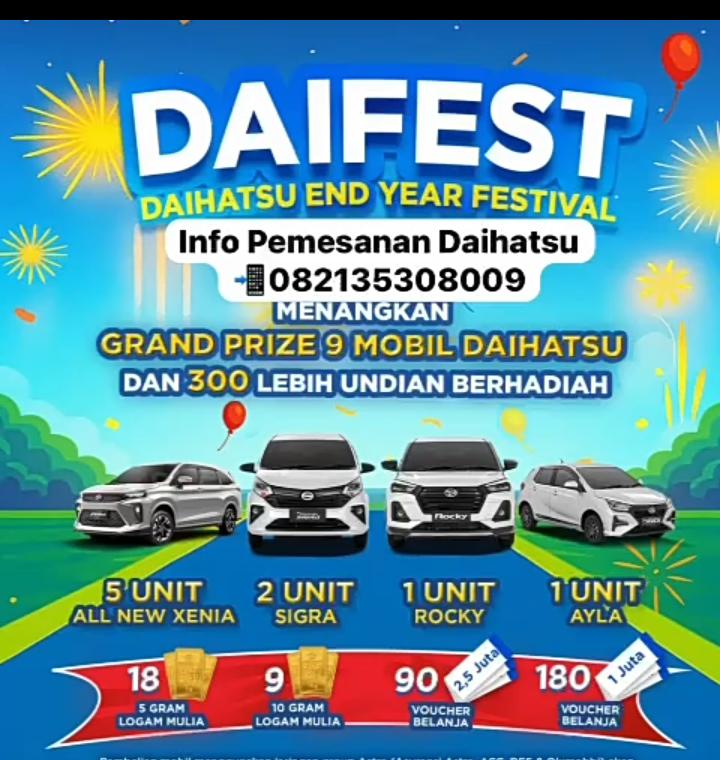 Dijelaskan juga bahwa hadiah hadiah tersebut nantinya akan diberikan saat pengiriman unit mobil yang dibeli kepada pembeli unit Daihatsu dan setelah itu masih ada Hadiah Grand prize 9 mobil Daihatsu berikut Logam emas dan voucher belanja yang diumumkan pada Bulan Januari 2026, pungkas Santi.