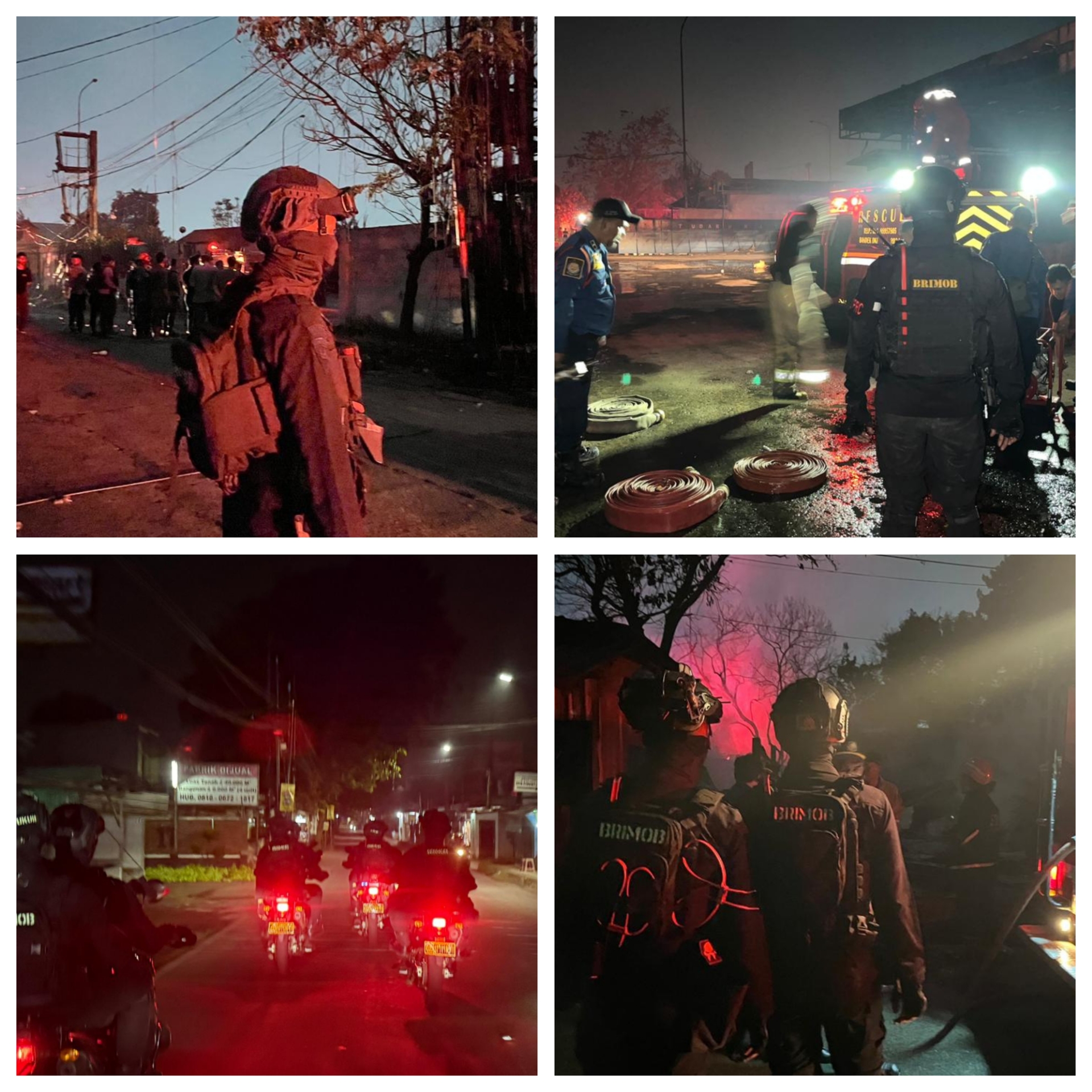 Bekasi – Personel Batalyon D Pelopor Satuan Brimob Polda Metro Jaya bergerak cepat melakukan pengamanan dan penanganan kebakaran di area SPBE PT Indogas Andalan Kita, Cimuning, Mustika Jaya, Kota Bekasi, Kamis dini hari (2/4/2026). Kebakaran di fasilitas gas elpiji tersebut berhasil dikendalikan oleh petugas pemadam kebakaran, sementara aparat memastikan kondisi tetap aman bagi masyarakat sekitar.